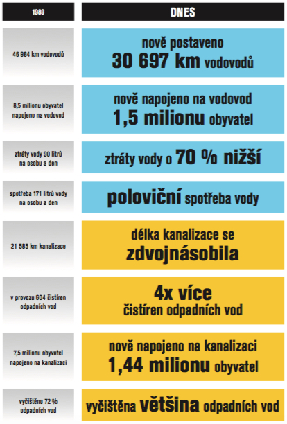 Pravda je, že v počtu vodovodních přípojek jsme na tom byli dobře už před revolucí. Celkem 82 procent obyvatel ČR mělo přípojku na vodovodní sítě. Dnes je toto číslo ještě o dvanáct procent vyšší – 94 procent z nás má napojení na centrální vodovod.